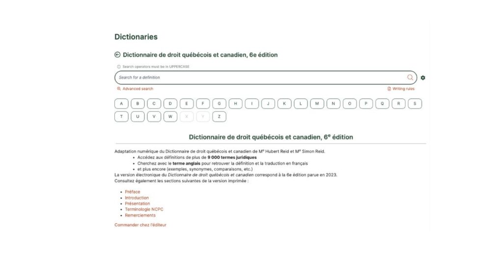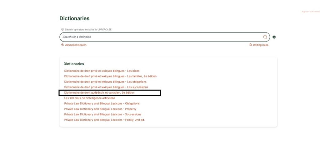 You’ll be taken to a page listing all available dictionaries, including the Dictionary of Quebec and Canadian Law.