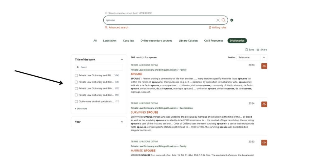 They can also be accessed directly via the Espace CAIJ search bar. Simply enter a term, then filter by content type “Dictionaries” and book title to select the right dictionary.