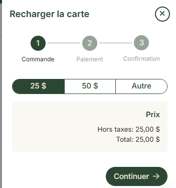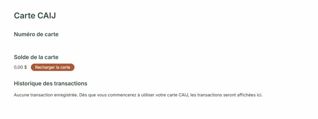 Once you’re in Espace CAIJ, click on your profile in the top right-hand corner, then on CAIJ Card in the menu. on the Refill the card button. A window will open to allow you to choose the amount you wish to charge to your card and the method of payment.