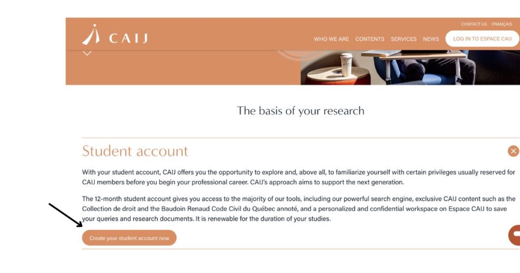 As a student, you can create a student account. Valid for 12 months, renewable throughout your studies, the student account gives you access to most CAIJ tools, as well as a personalized and confidential workspace on Espace CAIJ to save your research queries and documents, among other things.