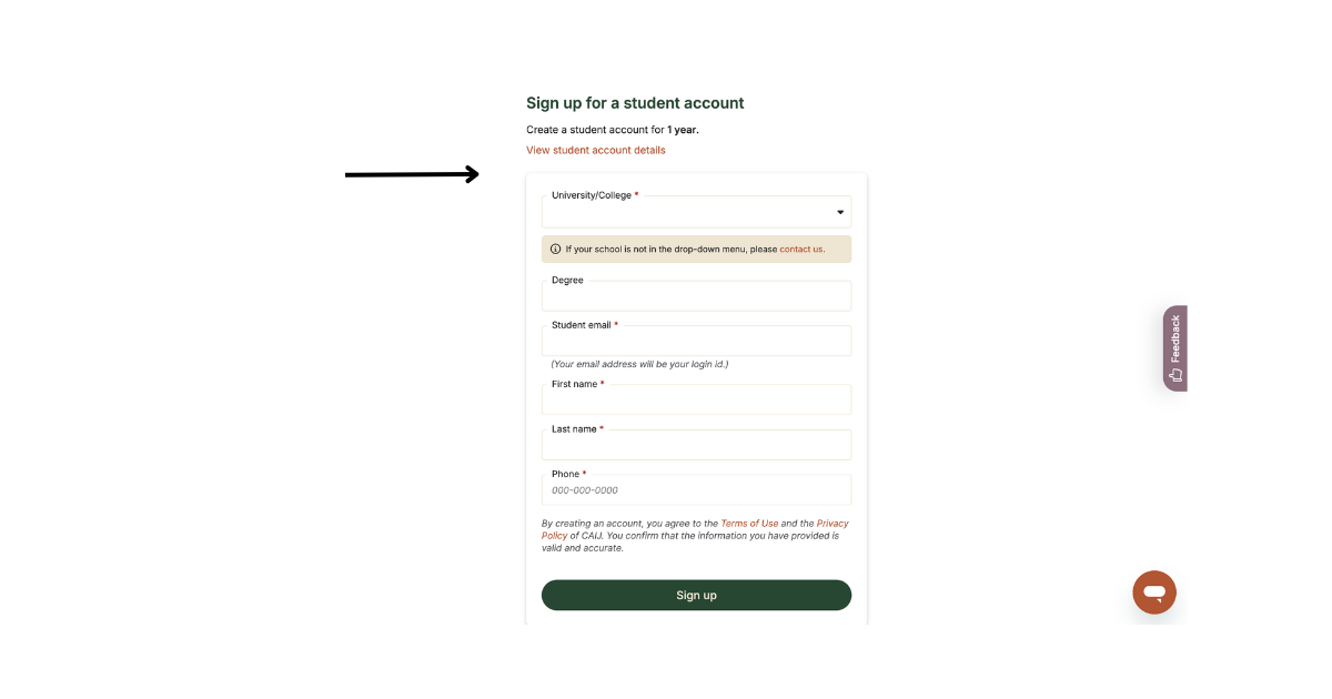 To create your student account, go to the Students page of the CAIJ website and click on Create your student account now.