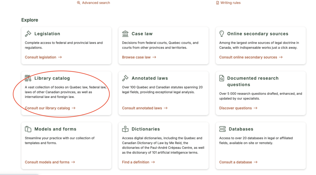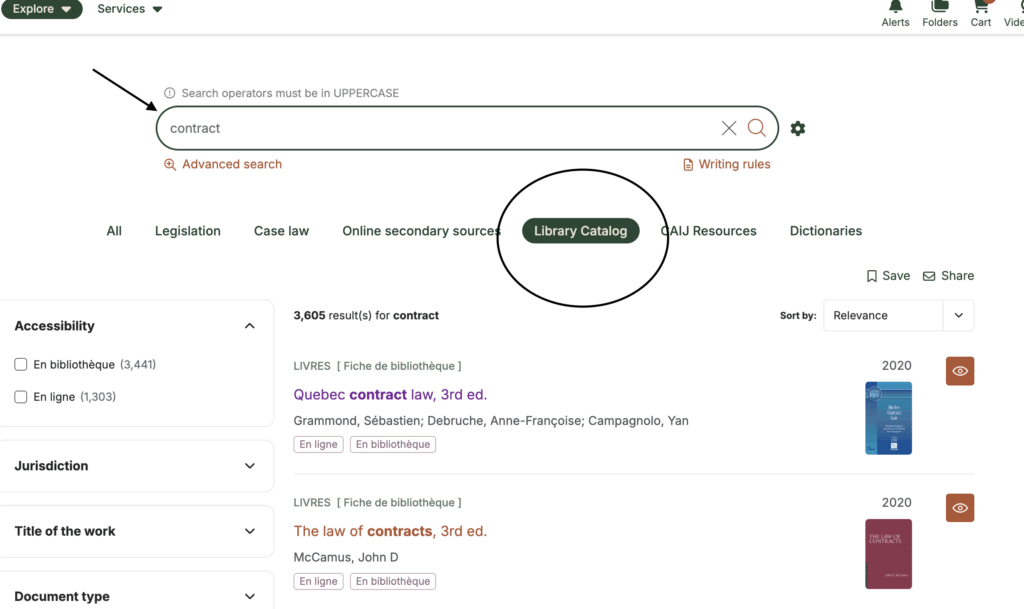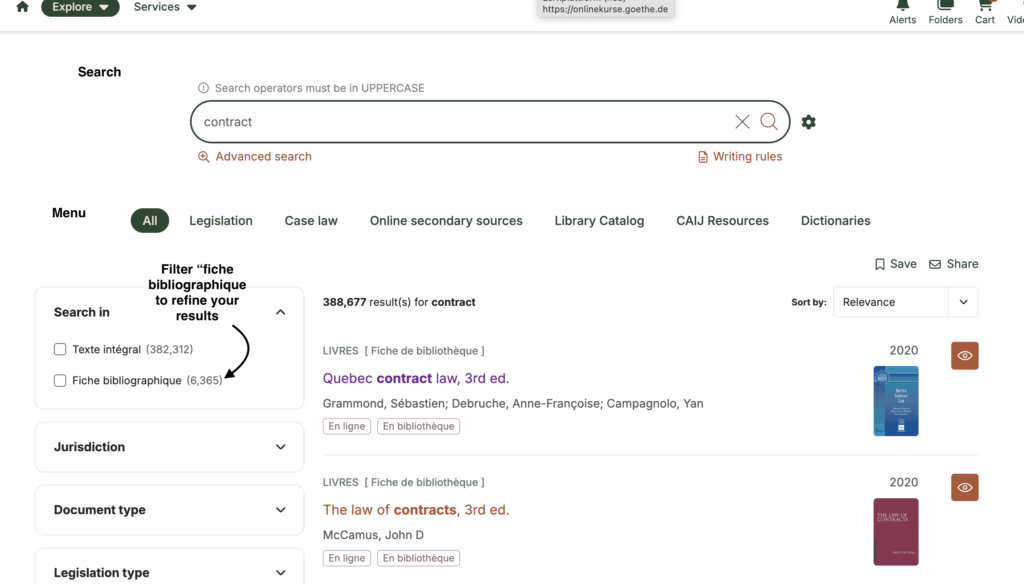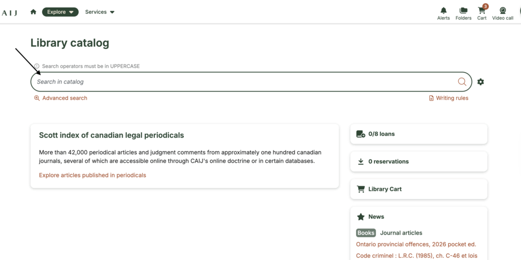 When you perform a search using the CAIJ search engine, you can access bibliographic data by refining your search by clicking on the Library Catalog tab in the top menu. Once the results are displayed, click on a title to obtain bibliographic information.