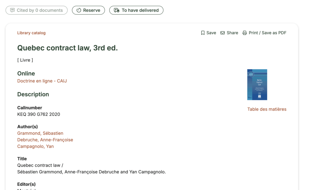 All the contents of the Library Catalog display results in the form of a card containing the usual bibliographic information that can be retrieved. If you start your search from the home page by selecting Library catalog, you will be able to select a title and consult this record.