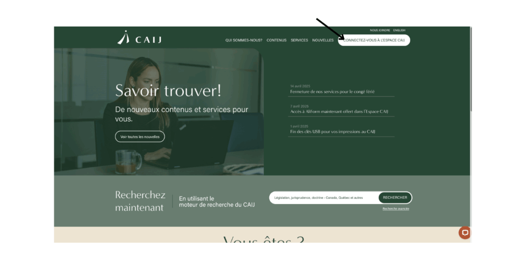 Sur le site Web du CAIJ cliquez sur Connectez-vous à l’Espace CAIJ.