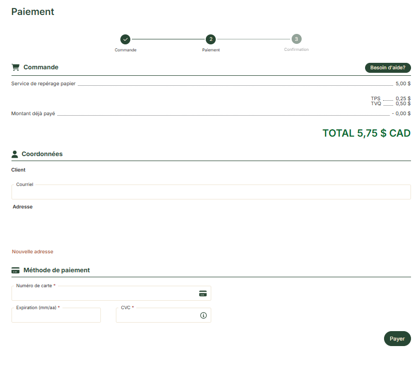 Lorsque vous passez une commande (formulaire, repérage, etc.), vous serez automatiquement redirigé vers une page de paiement.