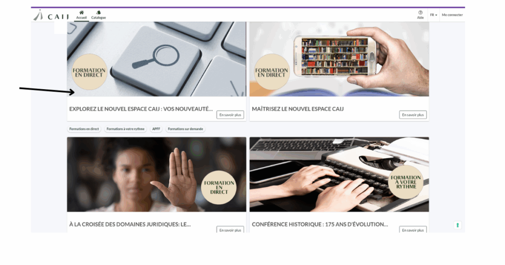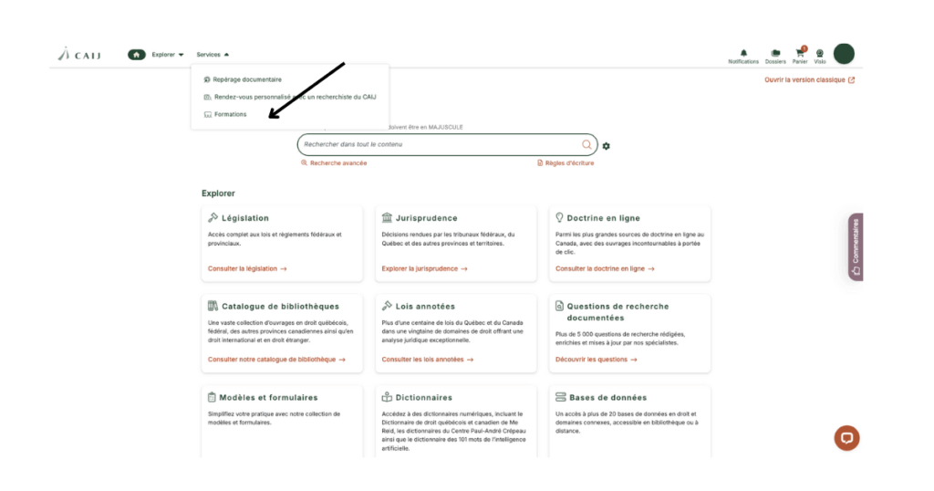 Pour vous inscrire, vous pouvez le faire de votre Espace CAIJ à partir de la page d’accueil en utilisant le menu Services et l’onglet Formation.