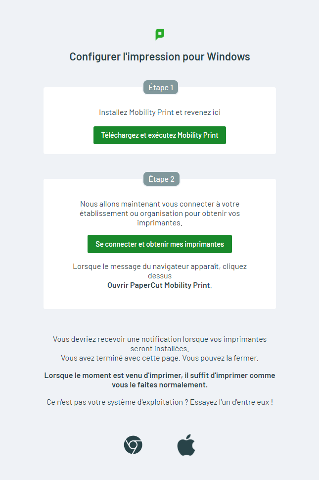 2. Cliquez sur « Téléchargez et exécutez Mobility Print ». L’installation d’un fichier débutera. Suivez les instructions pour installer le service d’imprimante mobile sur votre ordinateur.