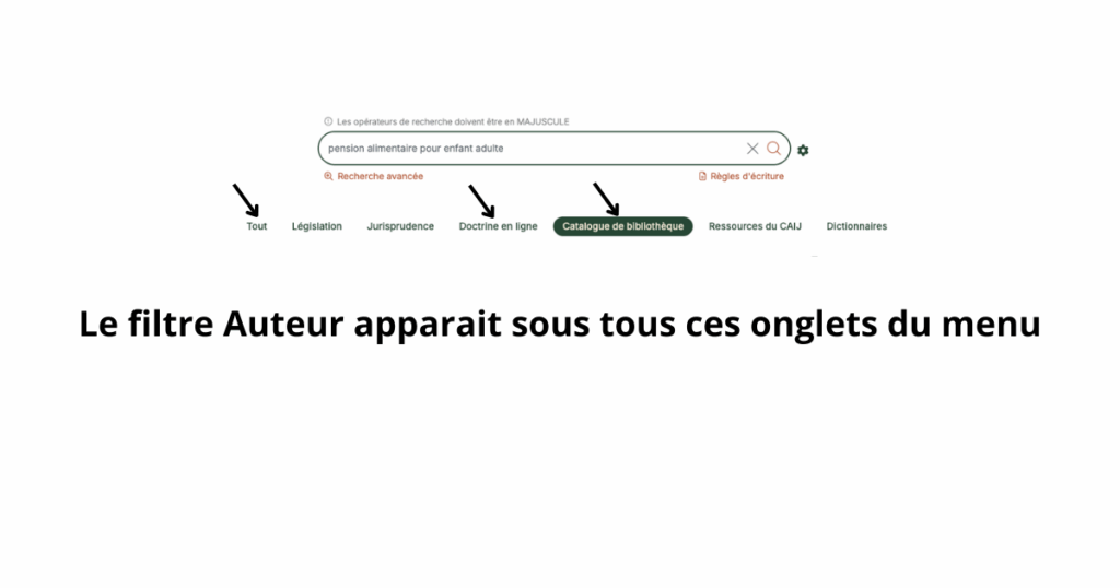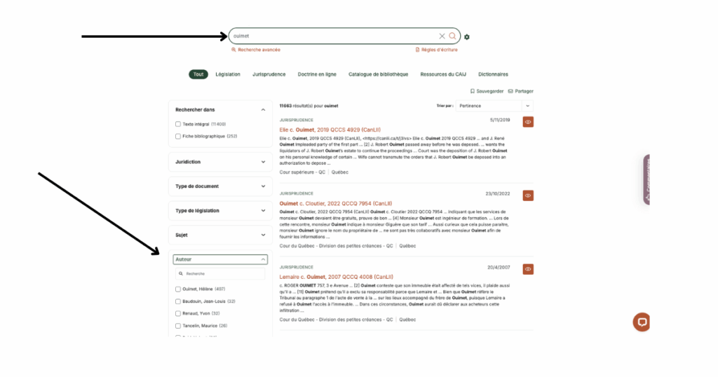 Dans l’Espace CAIJ, lorsque vous faites une recherche par le moteur de recherche du CAIJ et recherchez le nom de l’auteur ou tout autre mot clé si vous ignorez le nom de l’auteur, vous pourrez affiner vos résultats de recherche à l’aide du filtre Auteur présenté à gauche de votre écran.