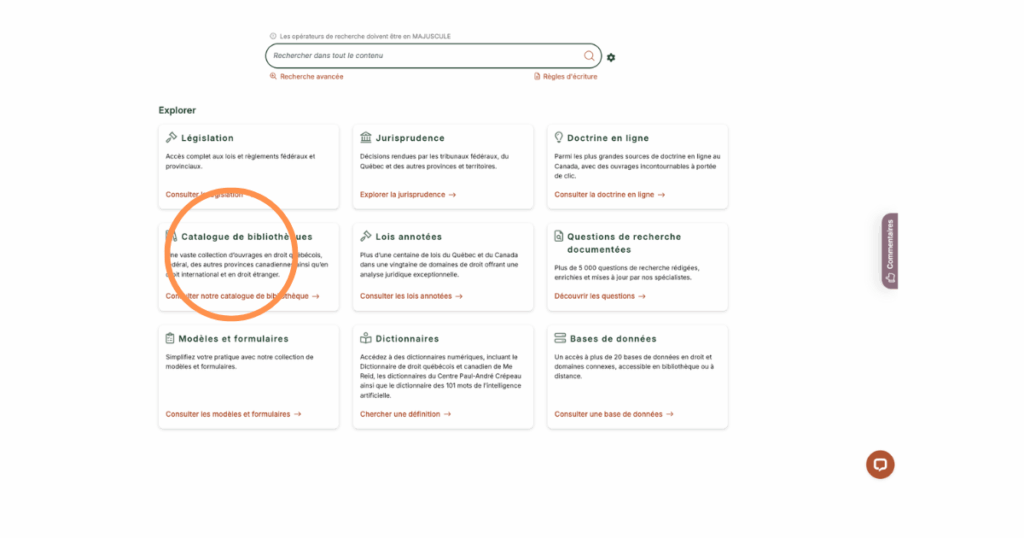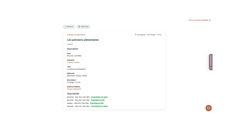 Tous les contenus du Catalogue de bibliothèques affichent des résultats sous la forme de fiche contenant les informations bibliographiques d’usage pouvant être reprise. Si vous débutez votre recherche à partir de l’accueil en sélectionnant Catalogue de bibliothèque, vous pourrez sélectionner un titre et consulter cette fiche.