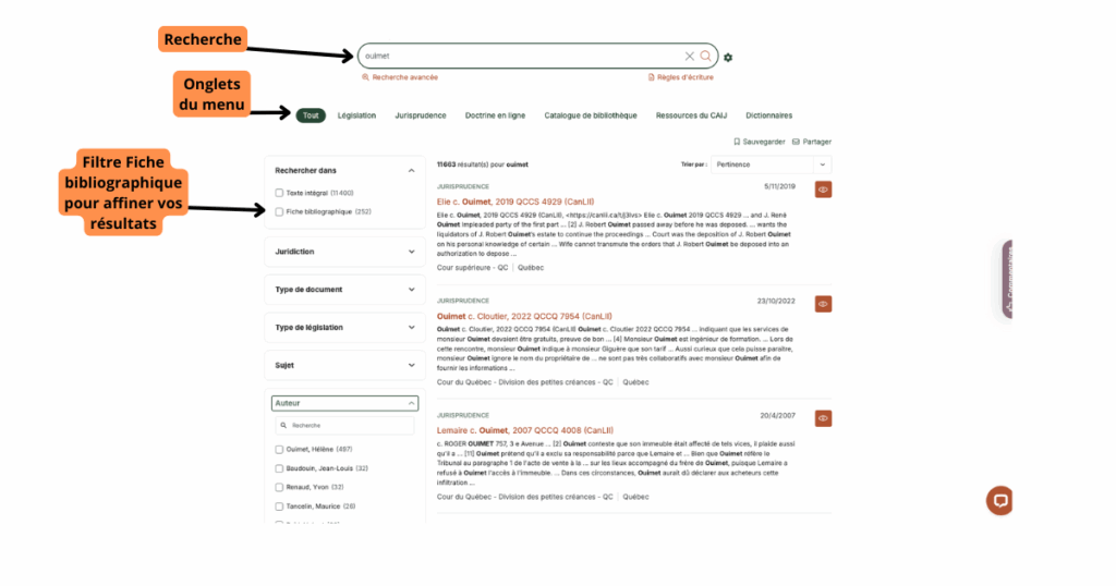 Vous pouvez aussi utiliser le filtre Fiche bibliographique dans les filtres disponibles à guache de votre écran lorsque vous faites une recherche à partir du moteur de recherche du CAIJ.