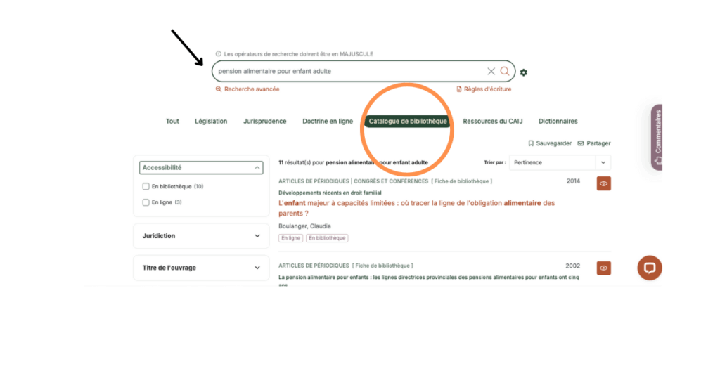Lorsque vous faites une recherche à partir du moteur de recherche du CAIJ, vous pouvez avoir accès aux données bibliographiques en affinant votre recherche en cliquant sur l’onglet Catalogue de bibliothèques dans le menu du haut. Une fois les résultats affichés, cliquez sur un titre pour obtenir les renseignements bibliographiques.