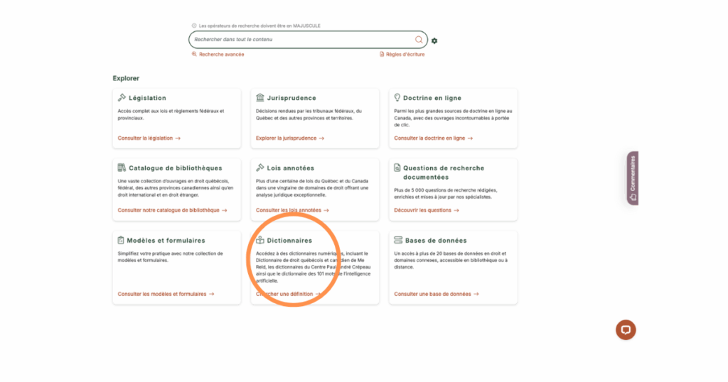 Pour y accéder, cliquez sur la carte « Dictionnaires » depuis la page d’accueil de l’Espace CAIJ :