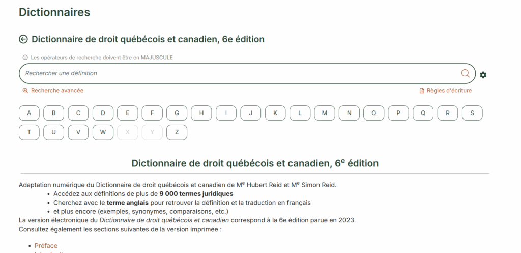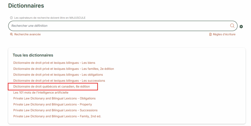 Vous arriverez sur la page listant tous les dictionnaires disponibles, dont le Dictionnaire de droit québécois et canadien.