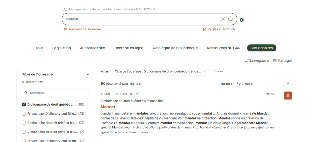 Il est également possible d’y accéder directement via la barre de recherche l’Espace CAIJ. Il suffit d’entrer un terme, puis de filtrer par type de contenu « Dictionnaires » et par titre d’ouvrage pour sélectionner le bon dictionnaire.
