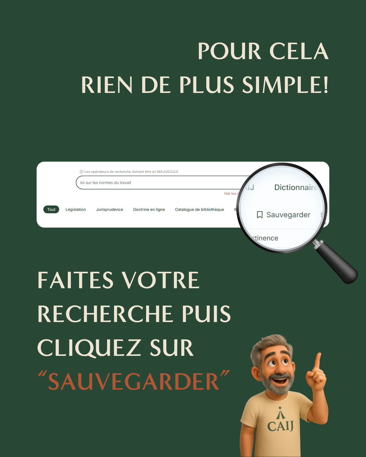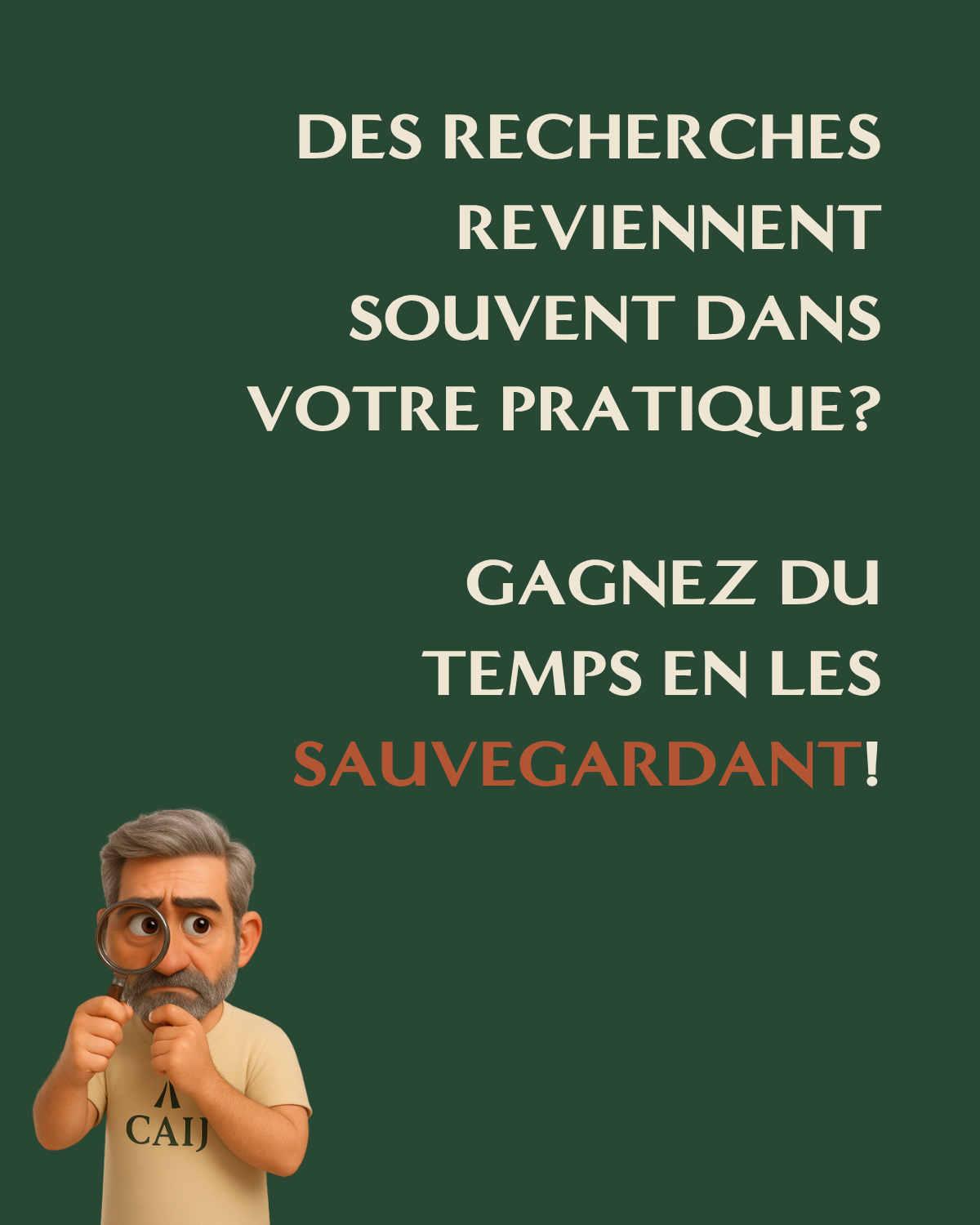 Certaines recherches juridiques reviennent souvent dans votre quotidien? Saviez-vous qu’il est possible de les sauvegarder dans votre profil Espace CAIJ pour y accéder facilement plus tard?