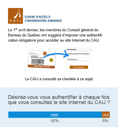 Afin de récolter les commentaires de ses utilisateurs à ce sujet, le CAIJ a mis en ligne un sondage sous la forme une fenêtre modale (pop-up) affichée lors de l’accès au site Internet du CAIJ et posant la question suivante : « Désirez-vous vous authentifier à chaque fois que vous consultez le site Internet du CAIJ? »