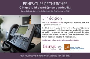 Cette année encore, la Clinique juridique téléphonique du JBM aura lieu dans nos locaux administratifs à Montréal.
