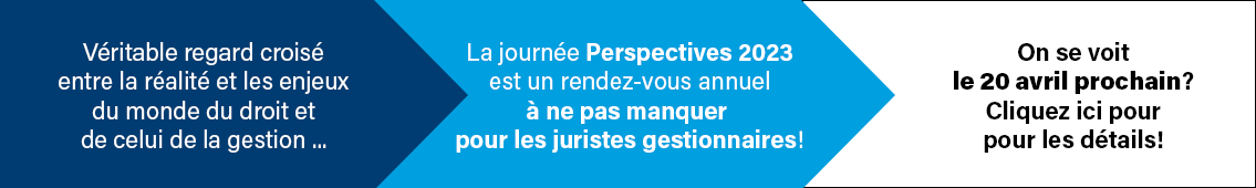 Perspectives 2023 est un événement de formation résolument pratique et axé sur le développement des compétences de gestion. Il s’agit également d’un lieu d’échanges et de rencontre pour les juristes occupant des fonctions de gestion.
